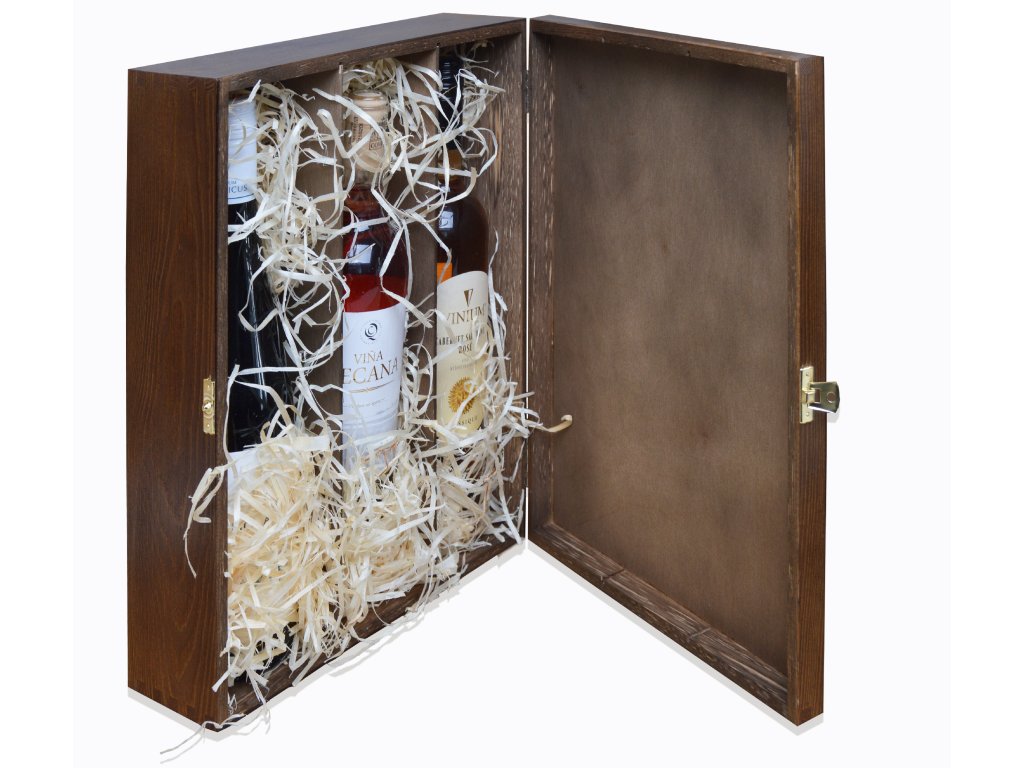 Dřevěná truhlička na tři láhve dobrého vína. Je vyrobena z pečlivě vybraného borovicového dřeva. Krabička je vhodná pro náročné zákazníky, kteří rádi obdarují své blízké nebo obchodní partnery stylově. Na přání do ní můžeme vypálit také Vaše logo nebo věnování laserem.