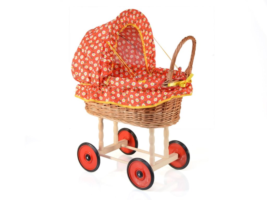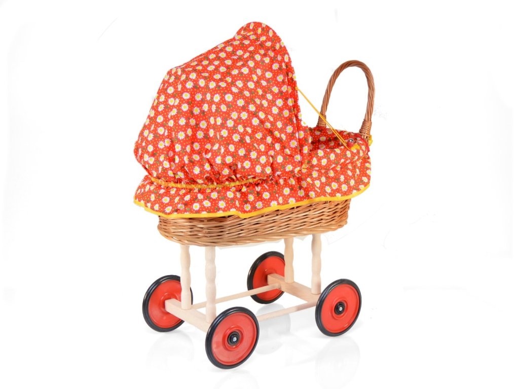 Kočárek pro panenky by neměl chybět v žádném dětském pokojíčku malé slečny. Proutěný kočárek je obšitý nádhernou červenou látkou s drobnými kvítky, která bude krásně ladit ke každé panence. Vnitřek kočárku je vystlán polštářkem a peřinkou ve stejném barevném provedení a jeho stříška je sklopná, aby měla panenka za krásného dne výhled na blankytně modrou oblohu.