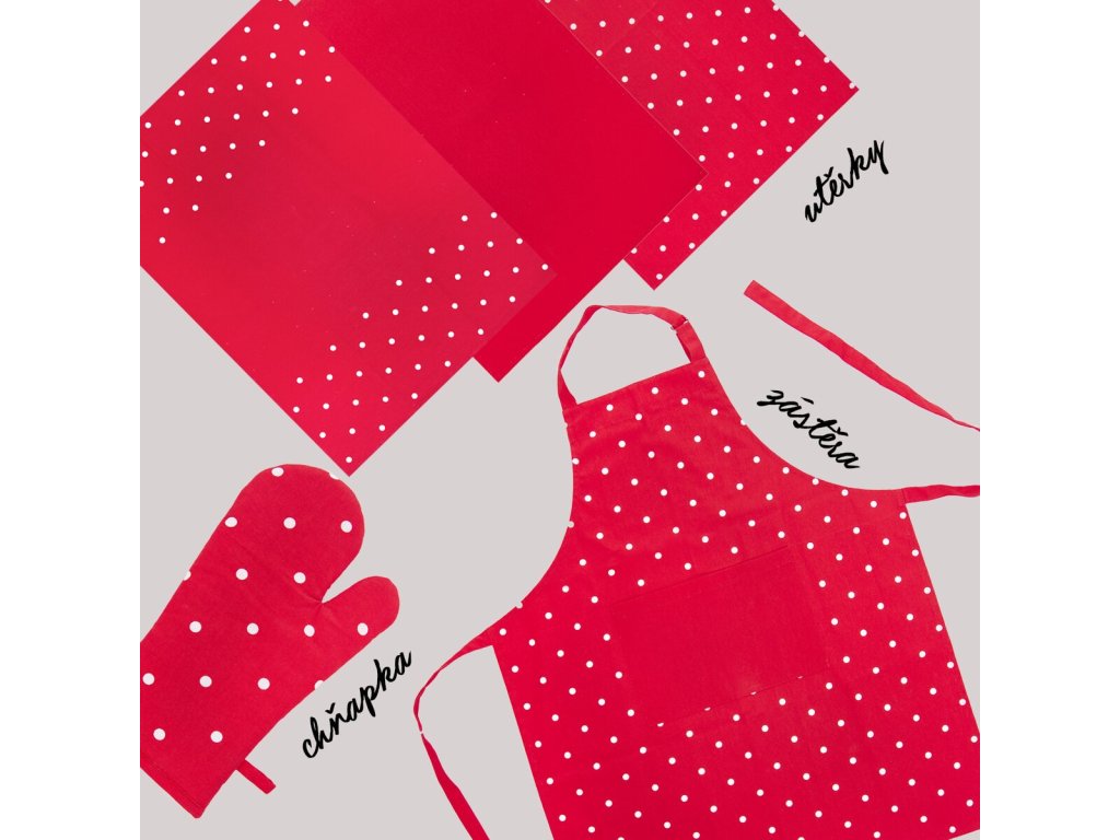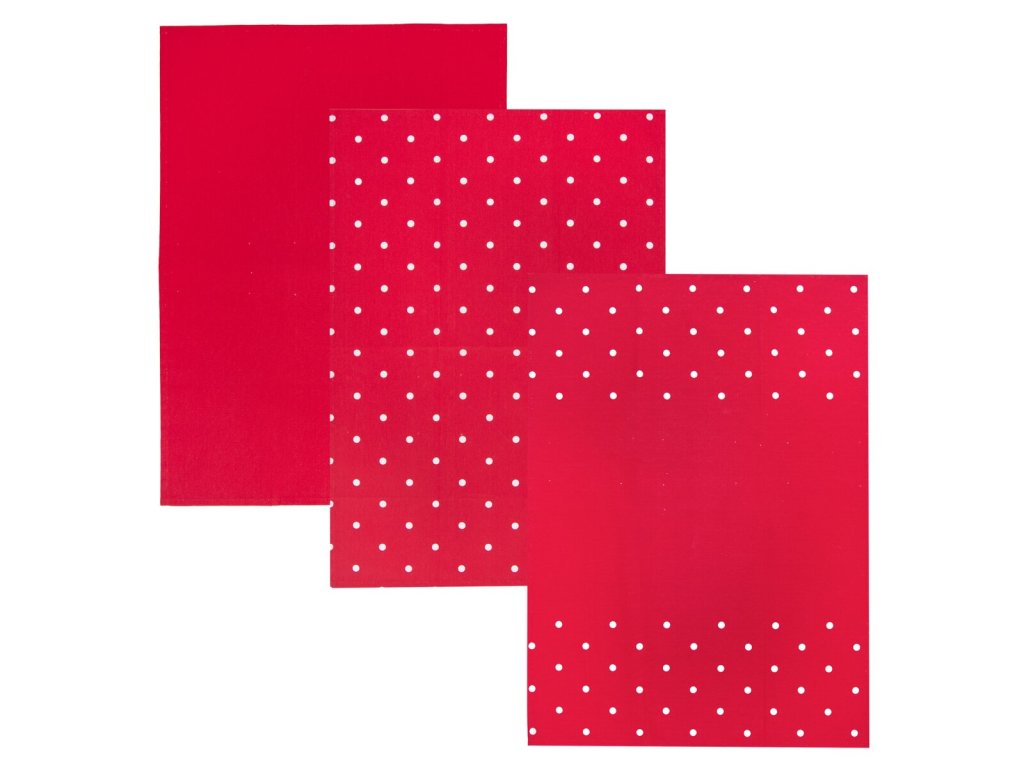 3 kusy utěrek o rozměrech 70×50 cm. Mají tři odlišná provedení. Všechny utěrky jsou opatřeny poutky k zavěšení.
