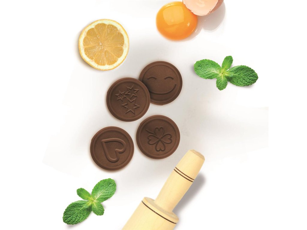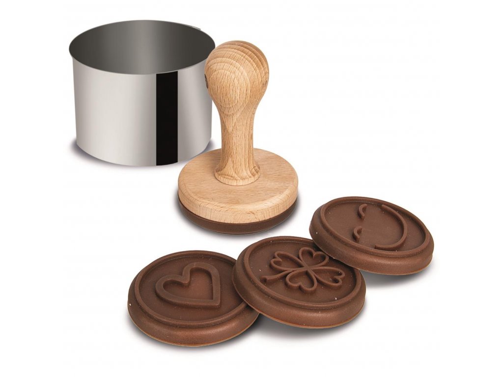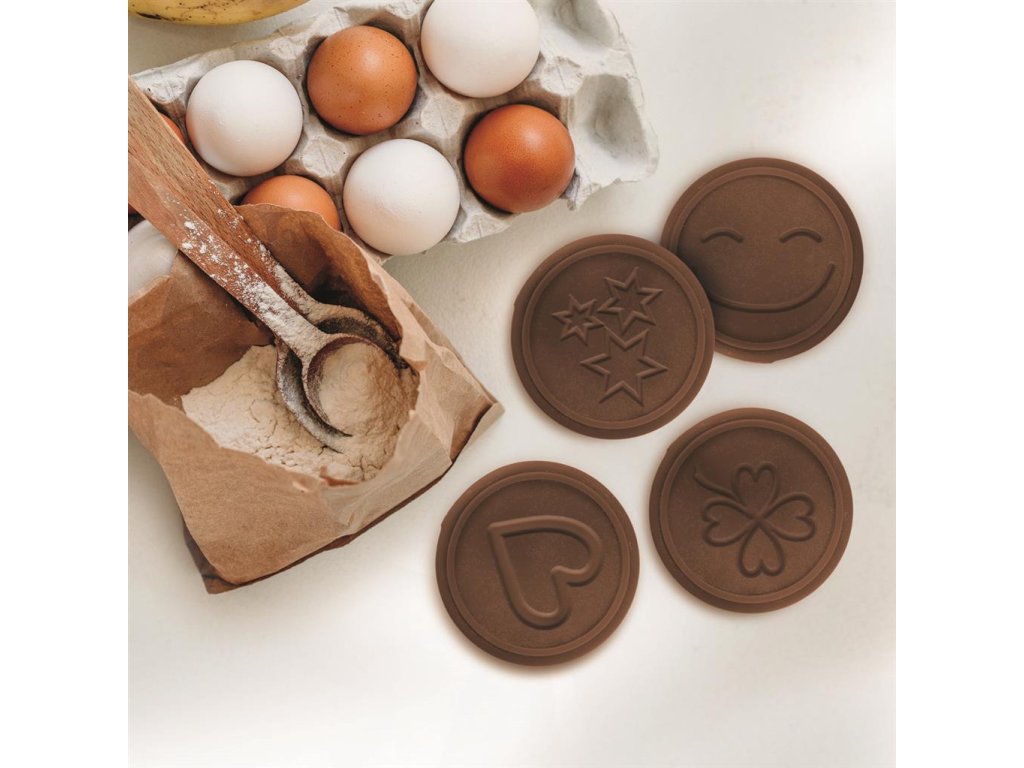 Razítko na výrobu domácích sušenek. V balení naleznete 4 varianty různých dekorů – silikonových snímatelných nástavců na dřevěný základ. Velmi rychle a snadno vytvoříte ornament na formičkou vykrojeném kolečku z těsta.