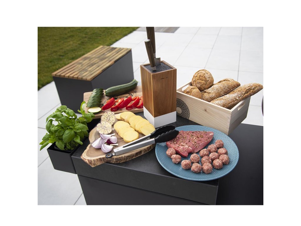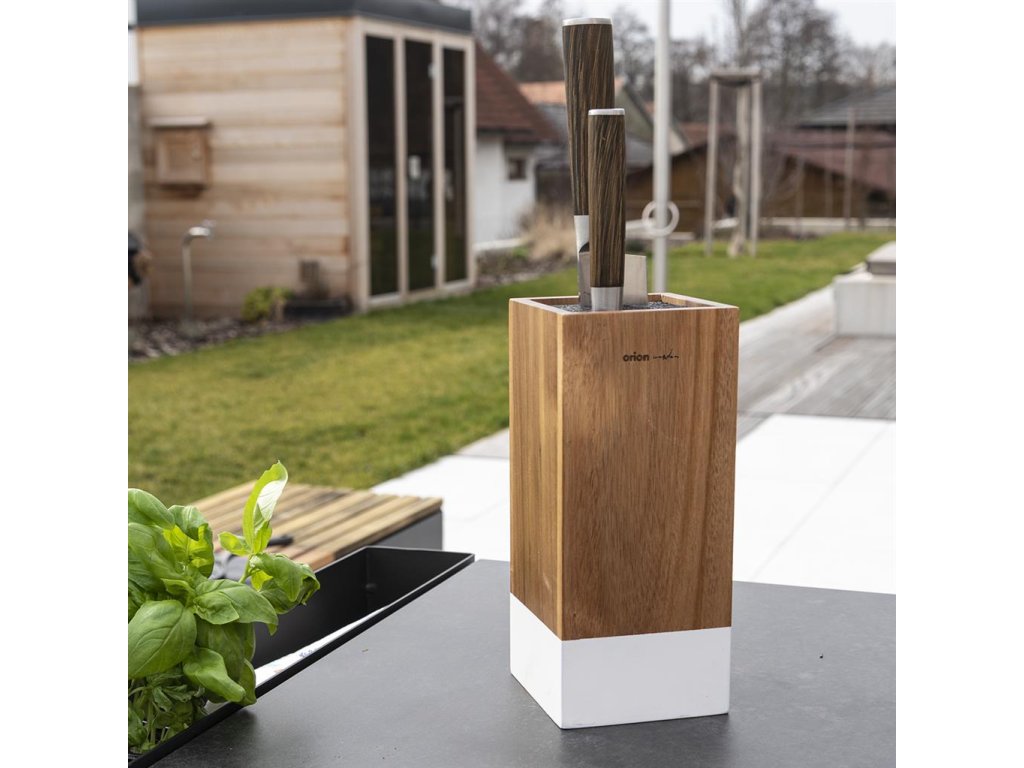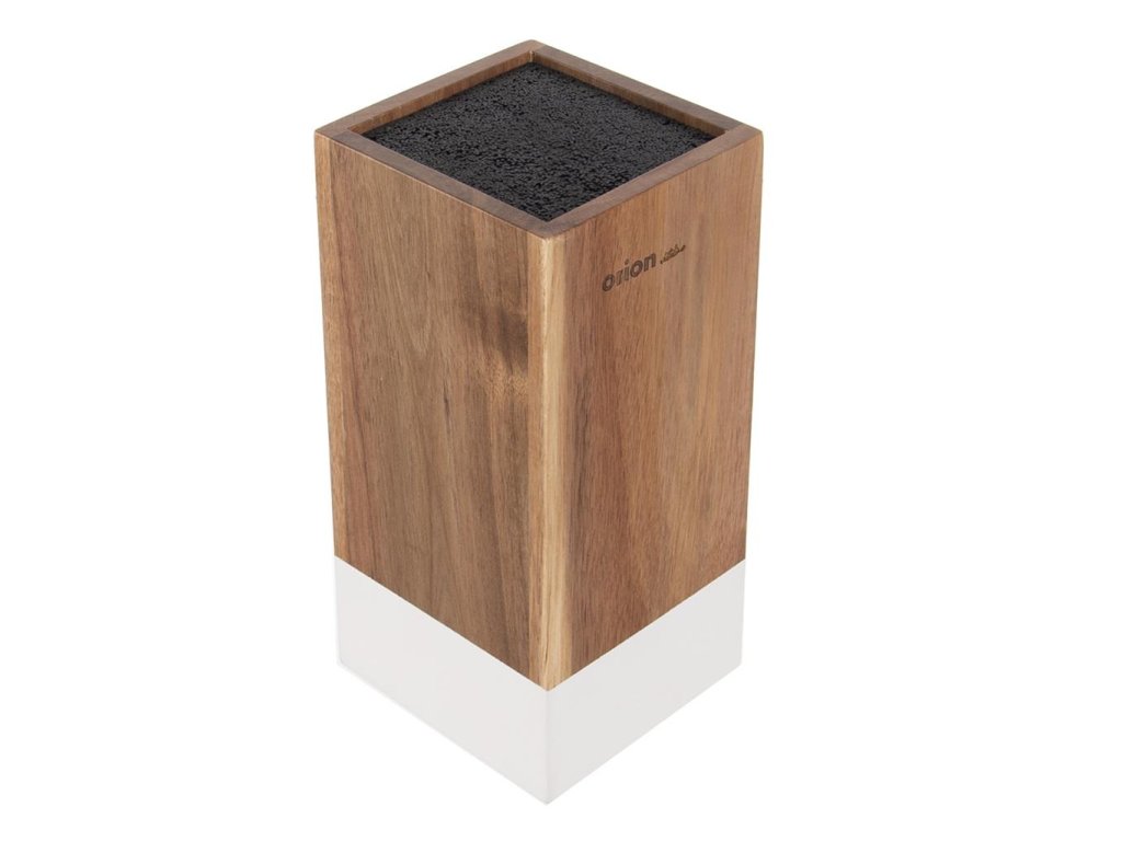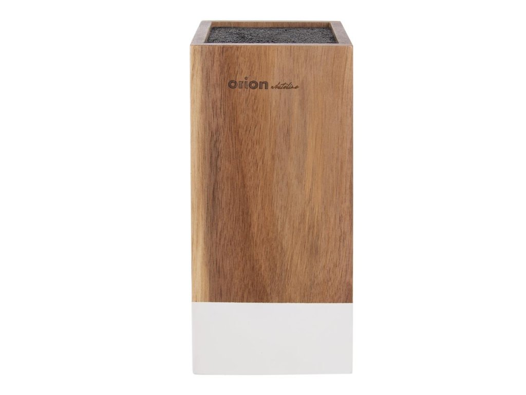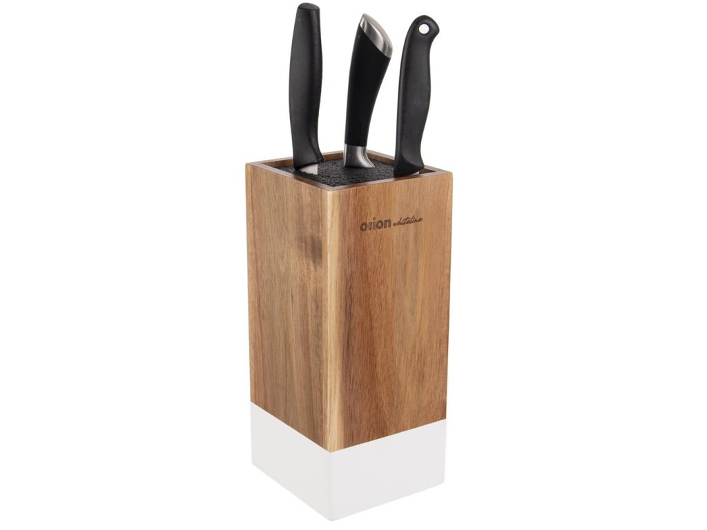 Stojan na nože z akáciového dřeva s plastovými štětinami. Pohodlně do stojanu uložíte nejen nože, ale i nůžky a jiné kuchyňské nástroje.