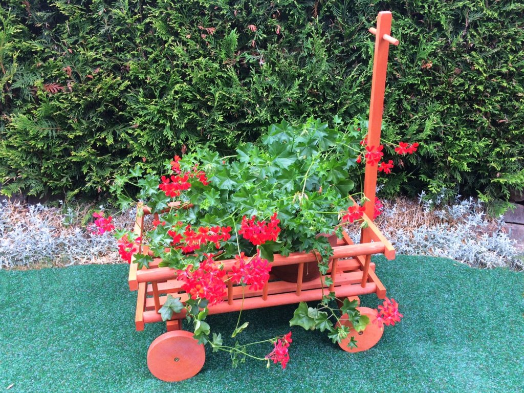 Žebřinový vozík lze ozdobit i kvetoucími letničkami. S tímto zahradním doplňkem bude vaše zahrada vypadat jako z pohádky. Trakař je vyroben z tvrdého dřeva, proto mu venkovní povětrnostní podmínky nijak neuškodí, navíc je opatřen nátěrem. Využití trakaře se meze nekladou.